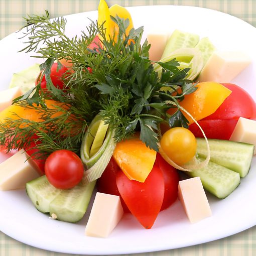 Состав: Свежие огурцы, свежие помидоры, сладкий перец, зелень и сыр