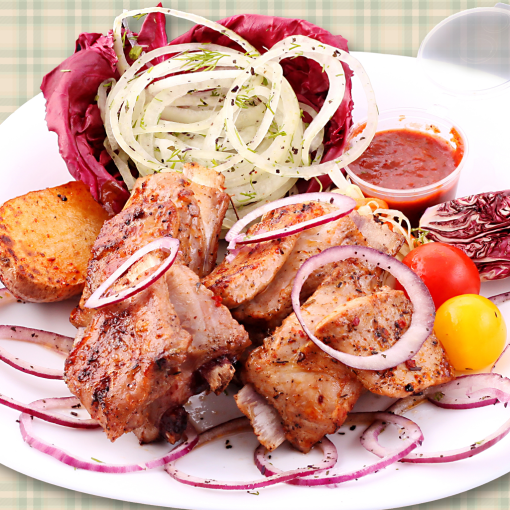 Состав: Великолепный шашлык из ягнёнка на кости с фирменным томатным соусом, картофелем, запечённым на мангале, репчатым луком и витаминным салатом.