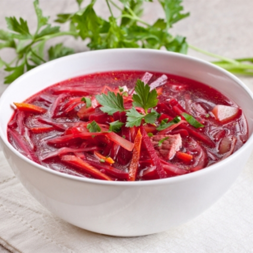 Состав: Говяжий бульон, кусочки варёной говядины, свёкла, морковка, картошка, капуста, зелень.
